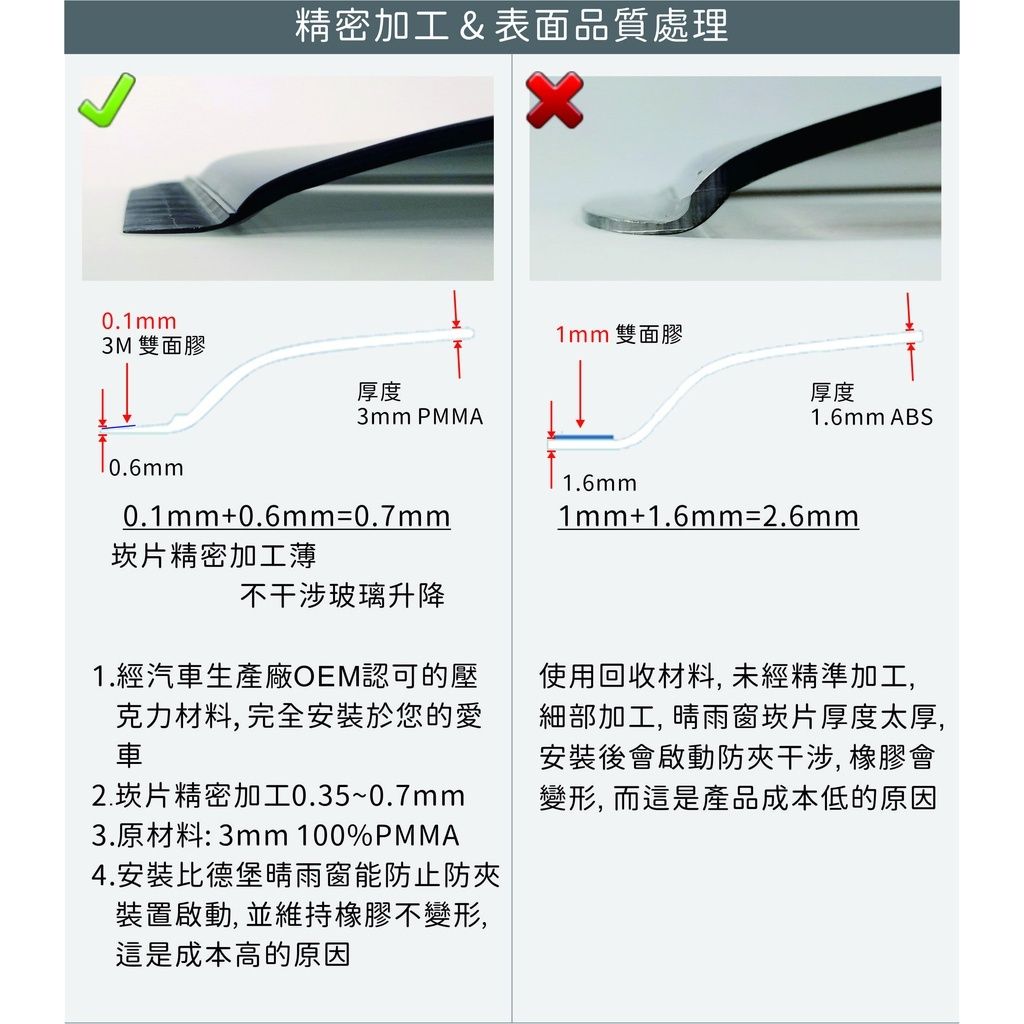 ✘ [劣質材料或混合材料]特性:高分子鍵結極差,太陽久曬或使用一段時間後容易變形、無法透視,行車安全堪憂....